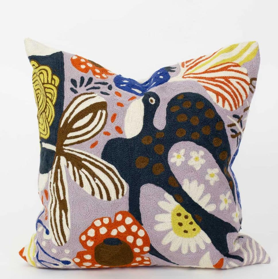 Une housse de coussin brodés à la main dans la région du Cachemire dans le nord de l’Inde. Le devant à motifs est 100 % laine et le dos est en coton blanc non blanchi.