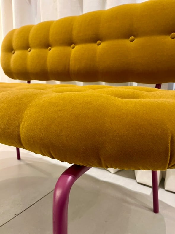 Entre esthétique et confort, il séduit par son velours aux teintes chaudes, capable de s’intégrer à toutes les ambiances, et par sa structure métal peinte en vermillon pour une touche pop. Vous pouvez choisir la couleur du velours et de la structure pour créer un modèle qui vous ressemble.