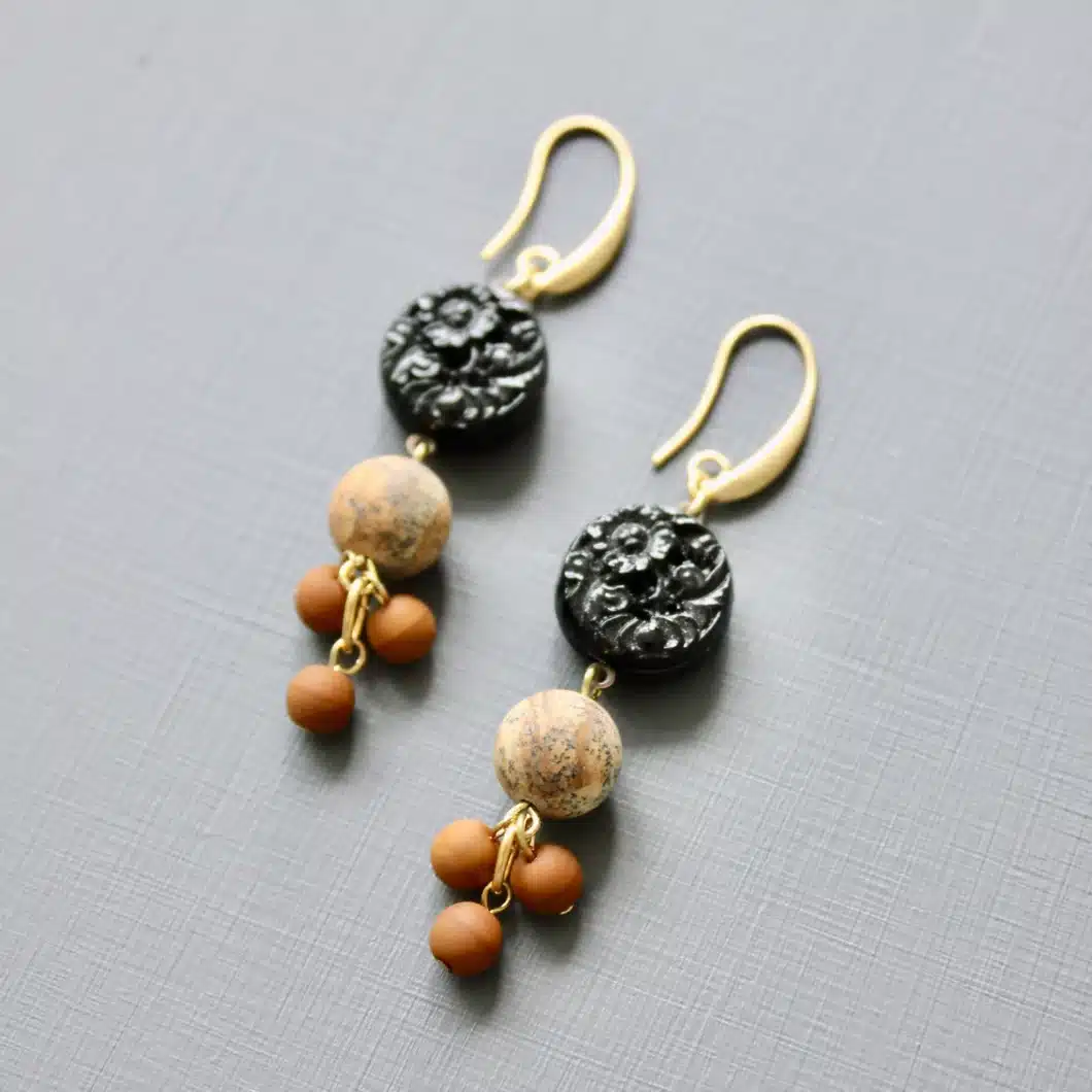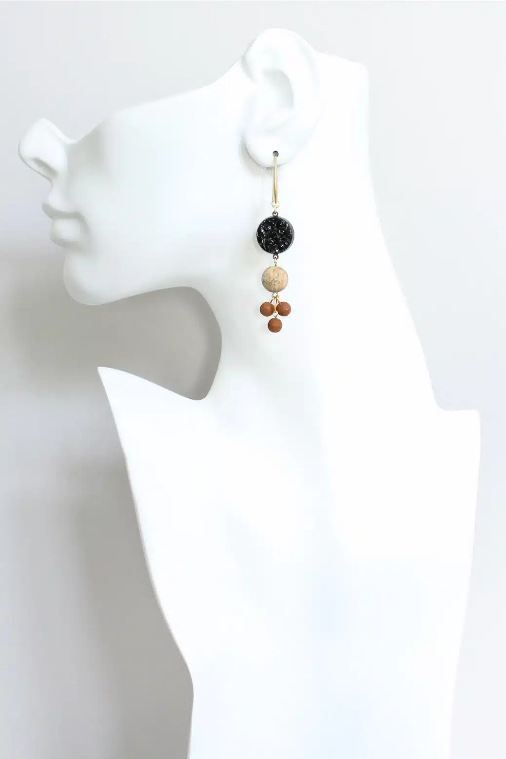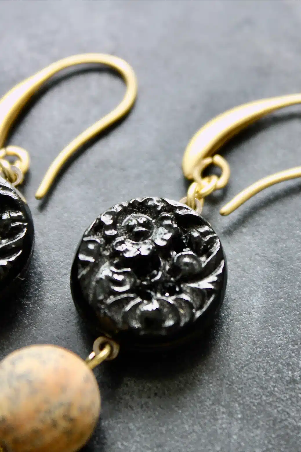 Composition : Crochets en laiton plaquรฉ or 18 carats avec verre pressรฉ japonais vintage, jaspe et verre.