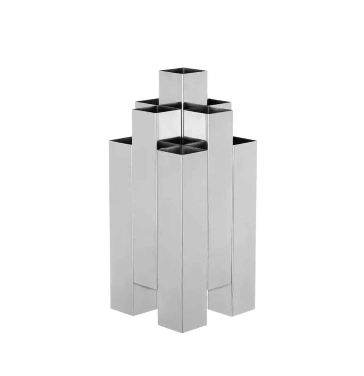 Apportez une touche d’architecture à votre intérieur avec le vase Tessera. Sa forme sculpturale et contemporaine en fait un objet à la fois décoratif et fonctionnel. Conçu en acier inoxydable poli miroir, il capte et reflète la lumière, créant un jeu lumineux dynamique dans votre espace.