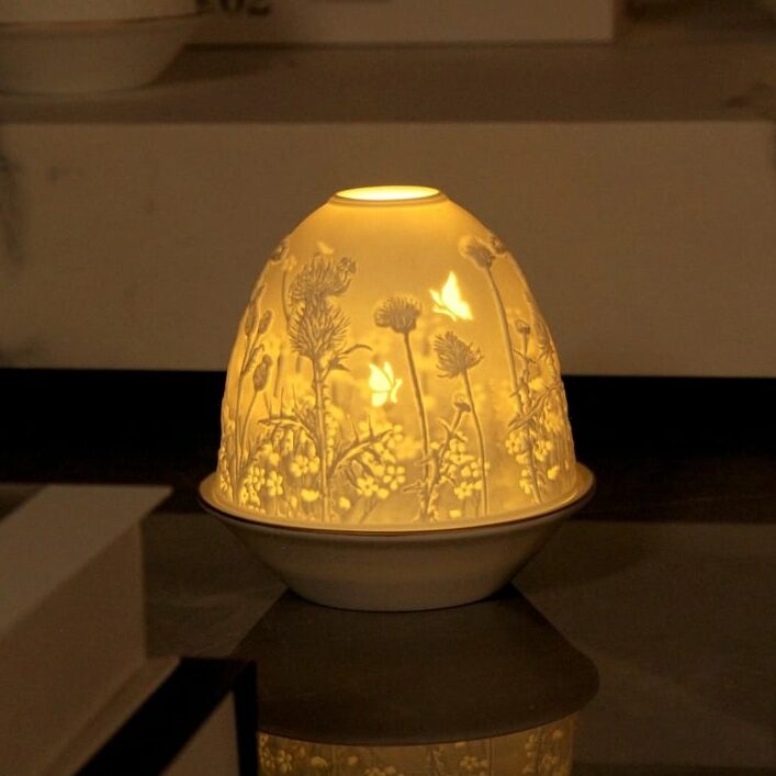 Un photophore dรฉcorรฉ de petits paysages fรฉeriques qui crรฉe une lumiรจre douce et chaleureuse. C’est un produit artisanal en porcelaine avec une finition mat et de belle facture. A utiliser avec des bougies chauffe-plat classiques. Idรฉal comme cadeau unique inspirรฉ de la nature, dรฉcoration des Fรชtes ou accessoire apaisant pour la maison pour tous ceux qui aiment la faune et la lumiรจre des bougies.