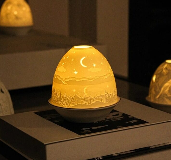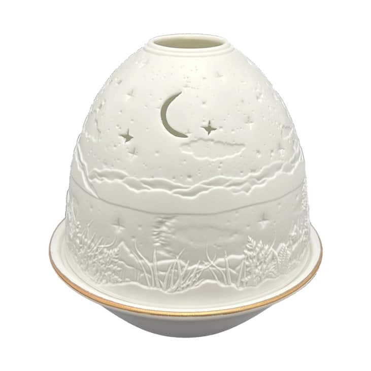 Un photophore décoré de petits paysages féeriques qui crée une lumière douce et chaleureuse. C’est un produit artisanal en porcelaine avec une finition mat et de belle facture. A utiliser avec des bougies chauffe-plat classiques. Idéal comme cadeau unique inspiré de la nature, décoration des Fêtes ou accessoire apaisant pour la maison pour tous ceux qui aiment la faune et la lumière des bougies.