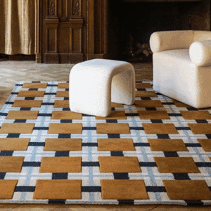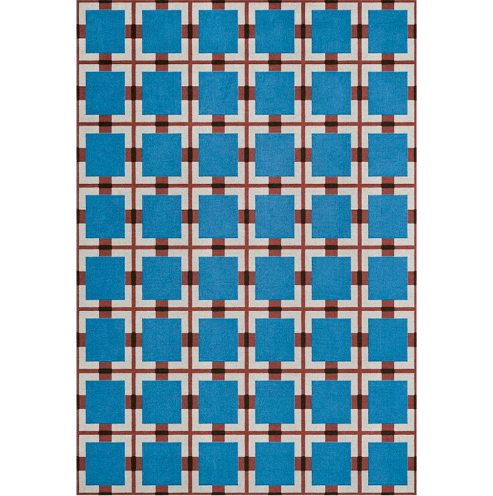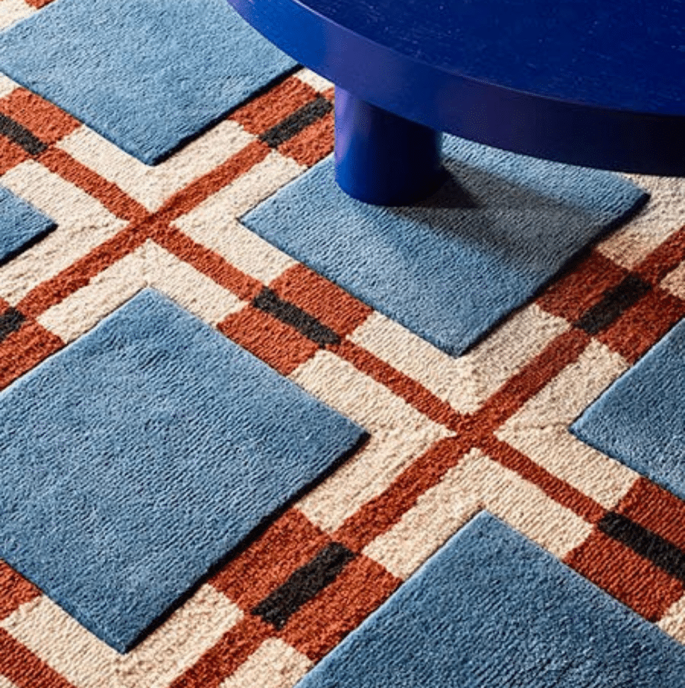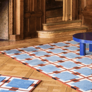 Le tapis bleuet est le fruit d’une e tapis 100 % laine est fabriqué à la main et marie innovation artistique et artisanat intemporel. Son design joue avec les motifs graphiques emblématiques de Kroon.