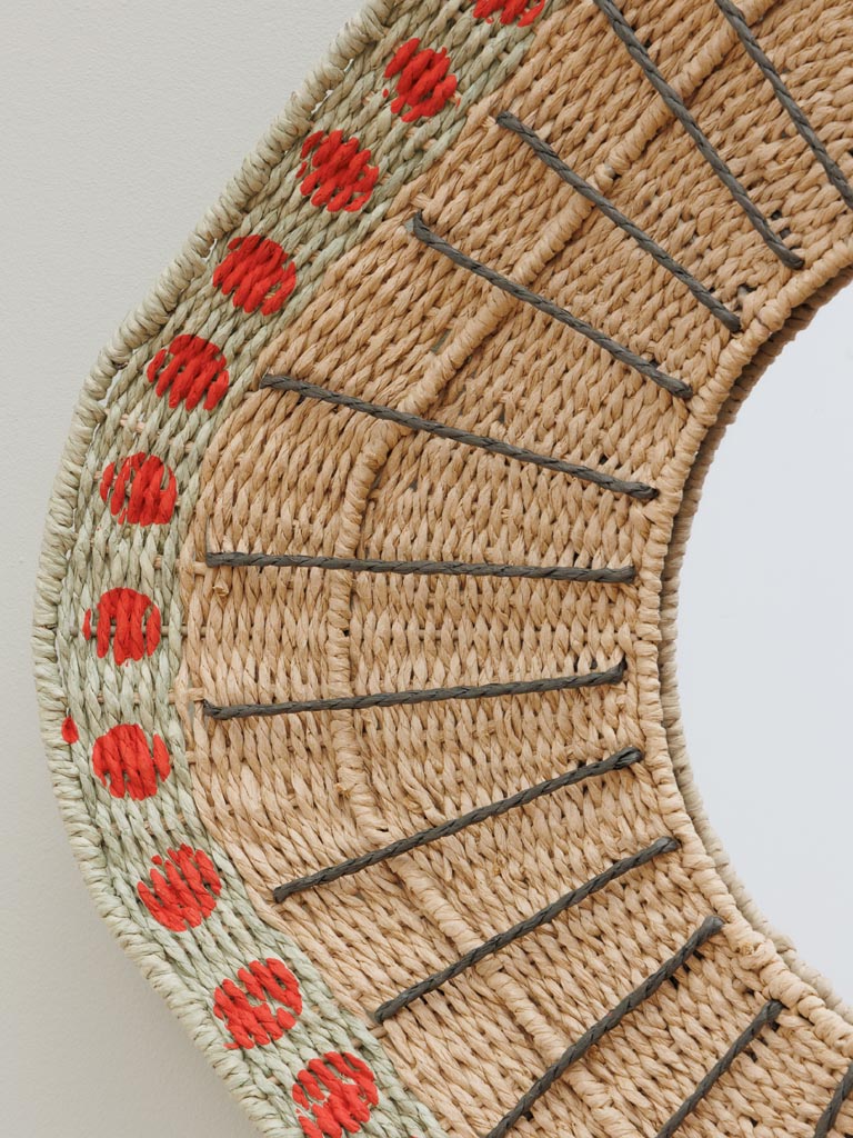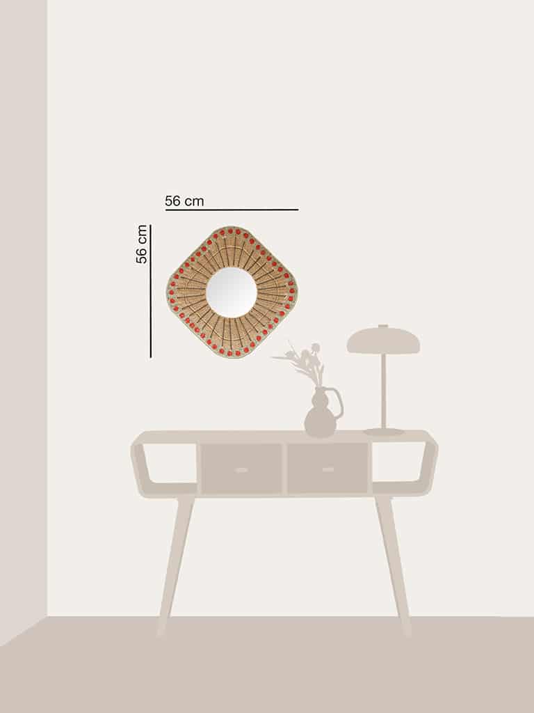 Ce miroir aux rayons tressés et rehaussés de points rouges, apporte une touche de lumière à votre intérieur. Son design inspiré du soleil, à la fois graphique et chaleureux, en fait une pièce idéale pour créer une ambiance bohème ou ethnique.